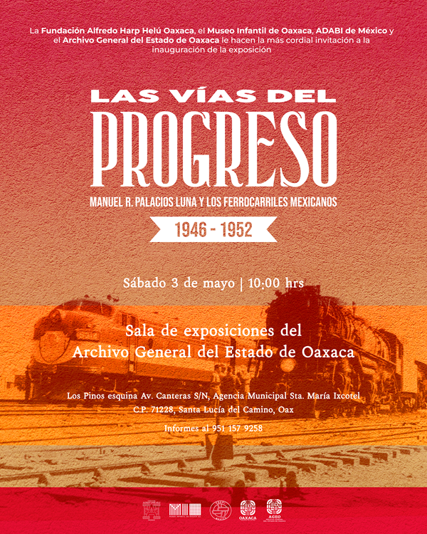 Oaxaca de Juárez, Oax., 23 de abril de 2025.- El Archivo General del Estado de Oaxaca (AGEO), la Coordinación de Archivos Civiles y Eclesiásticos Adabi Oaxaca, así como el Museo Infantil de Oaxaca (MIO), inaugurarán la exposición “Las Vías del Progreso: Manuel R. Palacios Luna y los Ferrocarriles Mexicanos (1946-1952)”; el sábado 3 de mayo a las 10:00 horas.