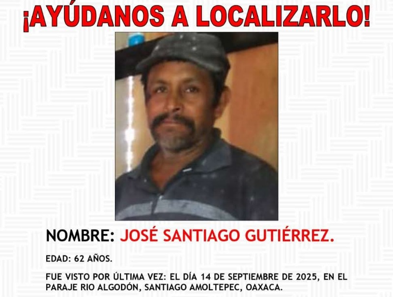 Oaxaca, Oax., 19 de septiembre de 2025.- José Santiago Gutiérrez, de 62 años, poblador de Santiago Amoltepec, desaparecido el 14 de septiembre, fue hallado muerto.