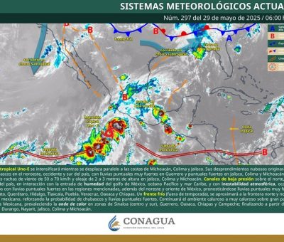 Oaxaca, Oax., 29 de mayo de 2025.- Para este jueves se prevén lluvias en gran parte de Oaxaca debido a la amplia circulación de la Depresión Tropical